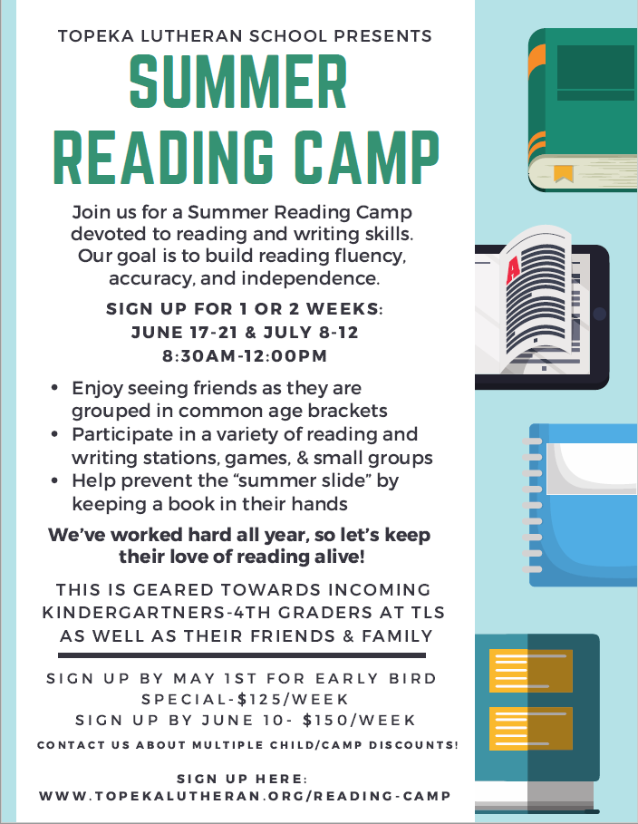 Summer Reading Camp is scheduled for June 17-21 and July 8-12 at TLS, for incoming kindergartners through 4th graders. The camp is devoted to building skills in reading and writing. To register or for more information, call the TLS office at 785.357.0382.